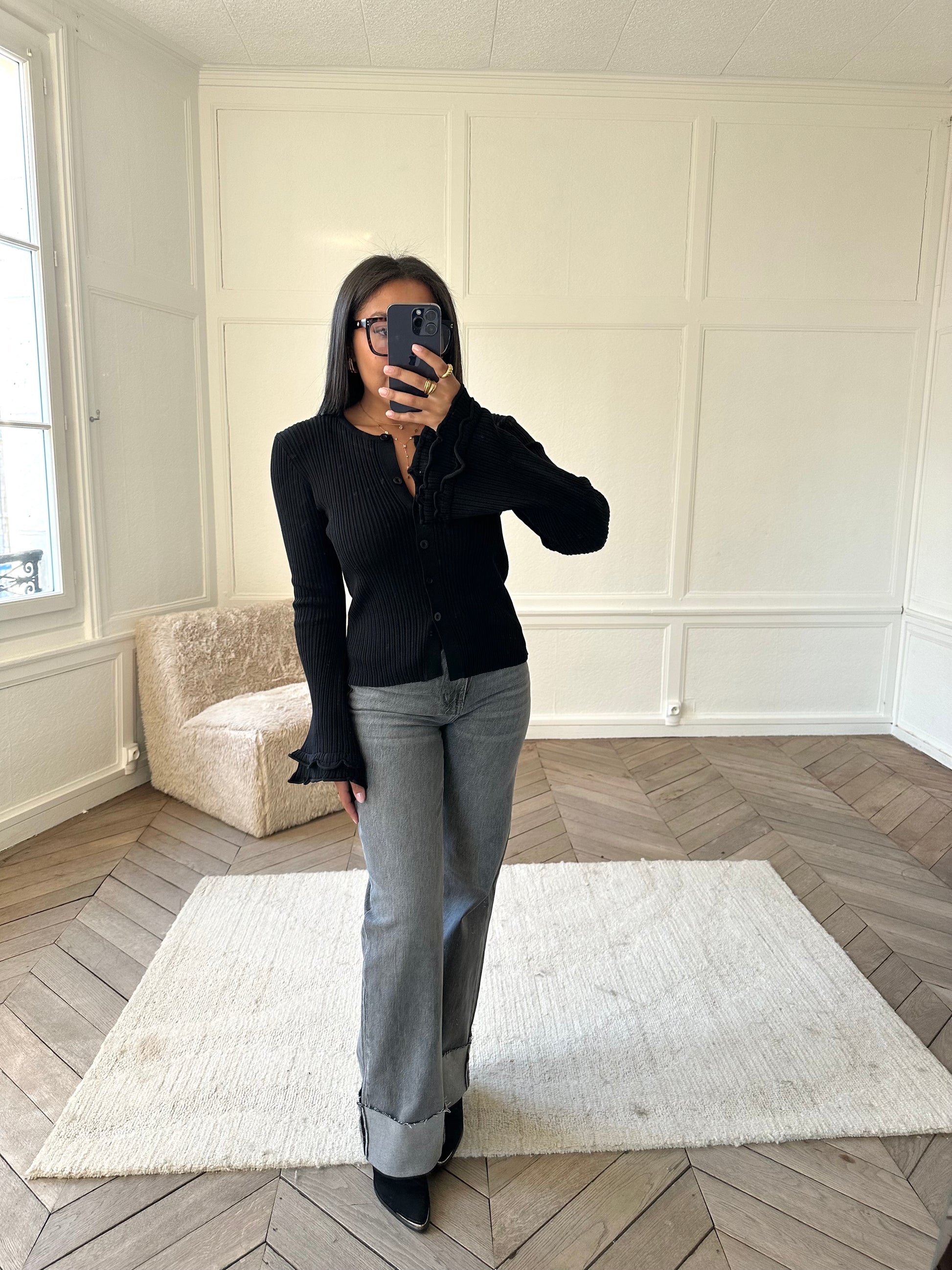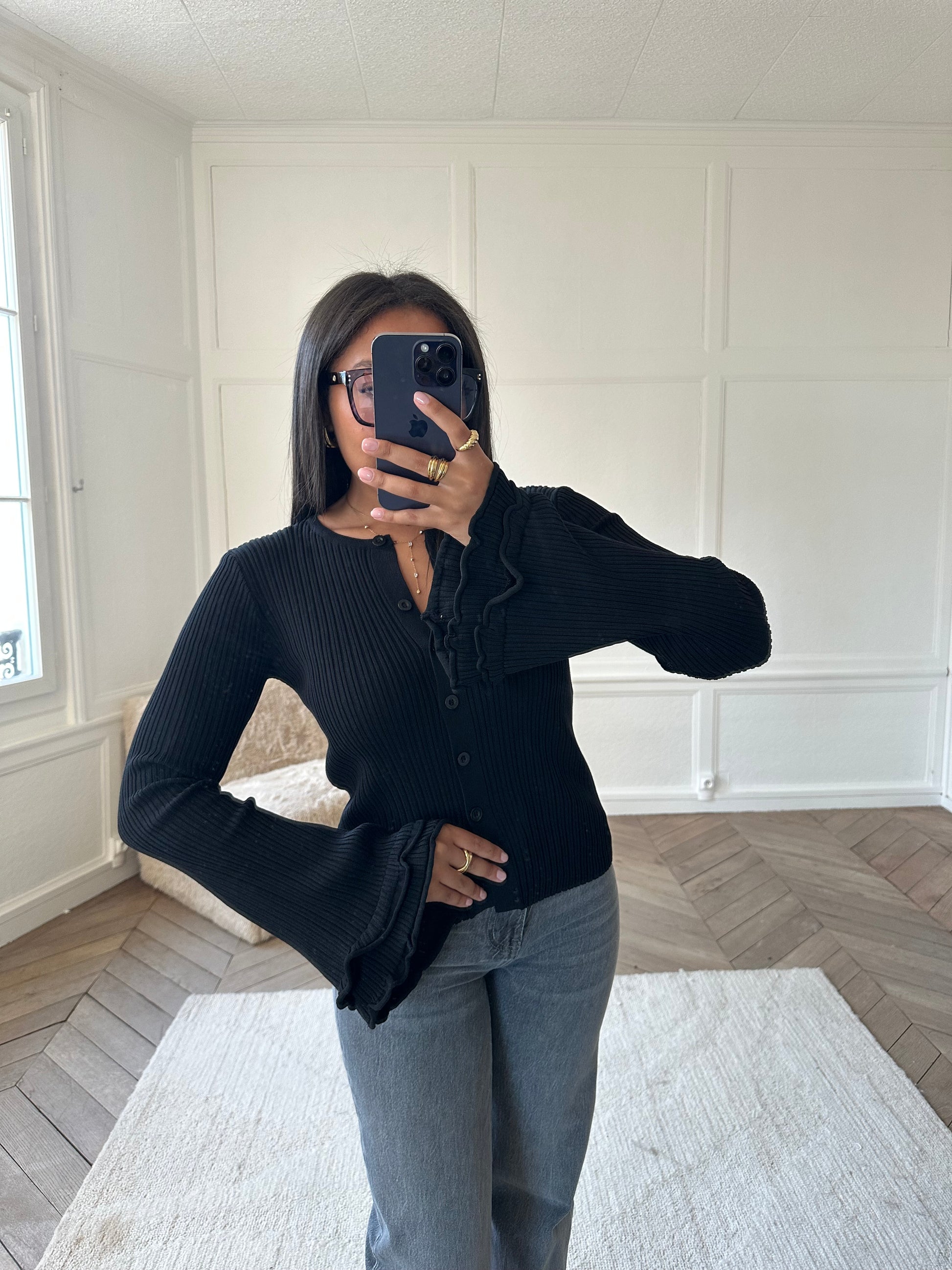 Ce gilet noir à manches longues est la pièce idéale pour allier chic et simplicité au quotidien. Sa maille côtelée apporte une touche moderne et structurée, tandis que les finitions volantées au niveau des manches ajoutent une note féminine.