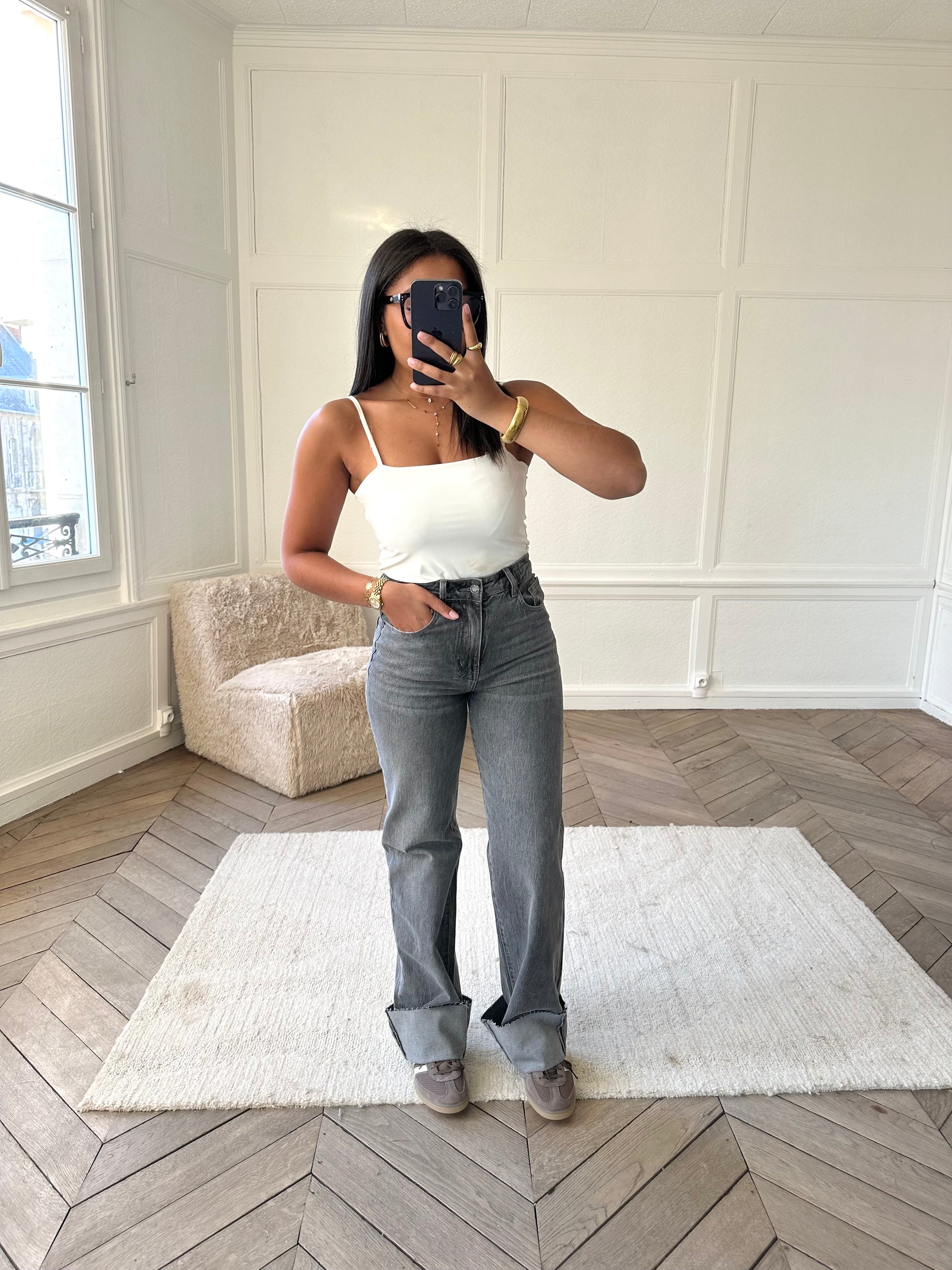 Jean droit gris à ourlets, coupe confortable et tendance. Un indispensable facile à porter au quotidien. L'ourlet de ce jean est non cousu donc parfait pour les plus grandes qui cherche un jean long et gris.