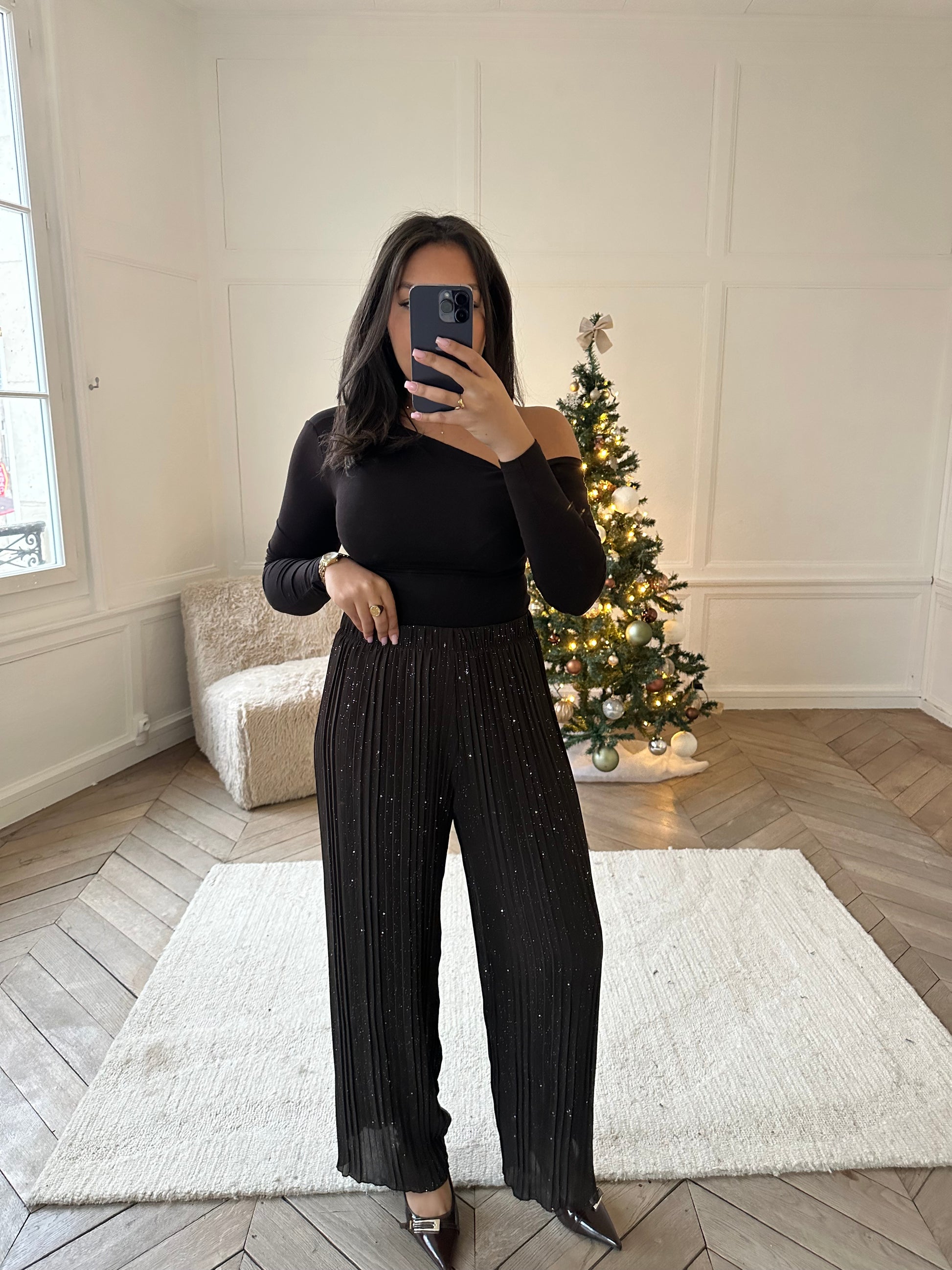 Illuminez vos soirées avec notre pantalon plissé noir à strass, une pièce incontournable pour créer une tenue de fête chic et élégante. Conçu dans un tissu léger et fluide, ce pantalon large noir scintillant apporte immédiatement une touche glamour à votre look tout en offrant un confort parfait grâce à sa taille élastique.